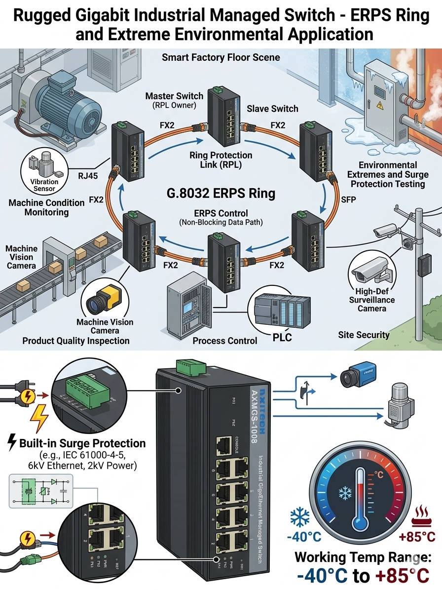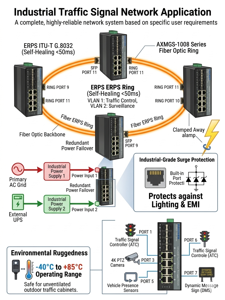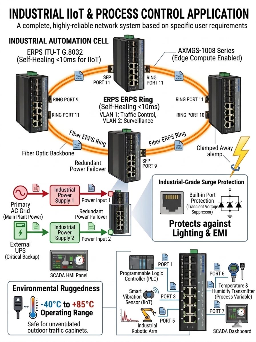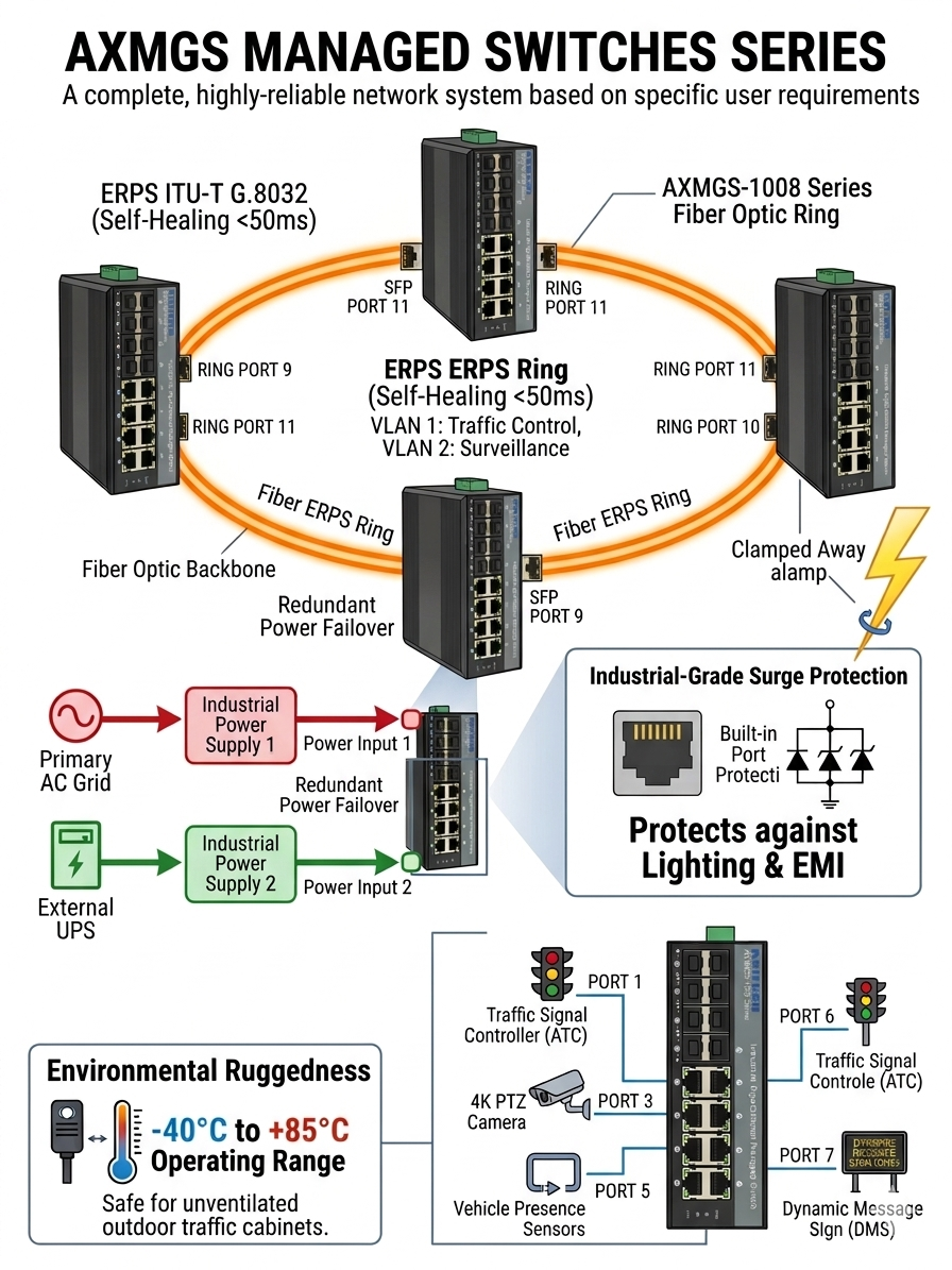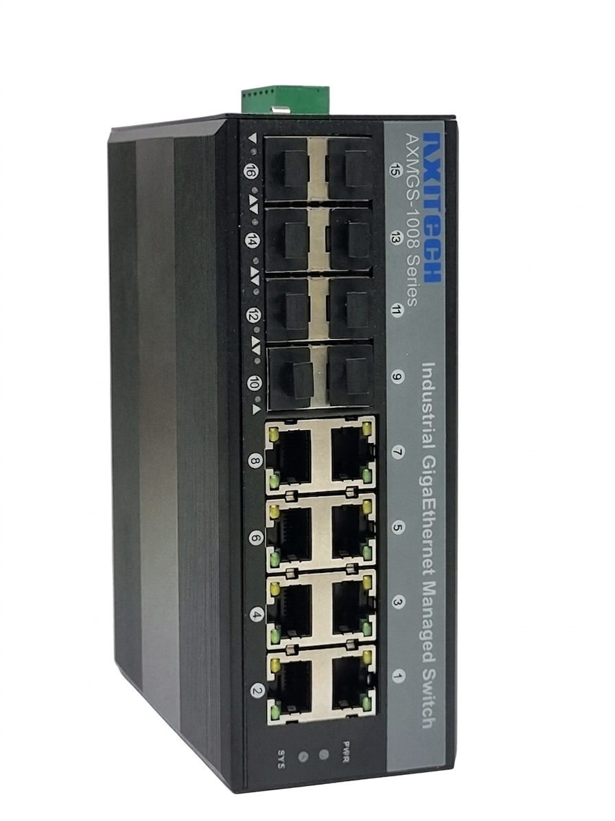 AXMGS-1008P –8 Nos 10/100/1000M POE port 802.3af/at +2/4/8nos SFP(1G) Ports(Optional) Post date March 20, 2026 No Comments on AXMGS-1008P –8 Nos 10/100/1000M POE port 802.3af/at +2/4/8nos SFP(1G) Ports(Optional) Categories: Industrial POE Switches, Industrial POE switches Managed Giga Series 802.3af/at (upto 30watt/port) Overview Specifications Features Compliance Drawing Ordering Downloads Overview Specifications Features Compliance Drawing Ordering Downloads Related products AXMGS-1004P –4 Nos 10/100/1000M POE port 802.3af/at +2 / 4 SFP ports Read more Industrial L2 managed 10/100/1000M Giga Ethernetswitch(1/2SFP+4TP) with POE+ supported AXMGS-1004-XSFP series is the 10/100/1000 Mbps managed industrial fiber switch, operating temperature-40 ℃ to + 85 ℃, support wide voltage…Read more AXGS-008P – 8 Nos 10/100/1000M POE port 802.3af/at Read more Industrial POE switches Unmanaged Giga Series 802.3af/at (up to 30watt/port) Read more ← AXMGS-1004P –4 Nos 10/100/1000M POE port 802.3af/at +2 / 4 SFP ports → AXMGS-1024P –24 Nos 10/100/1000M POE port 802.3af/at +4 no SFP(1G) Ports Leave a Reply Cancel replyYour email address will not be published. Required fields are marked *Comment * Name * Email * Website Save my name, email, and website in this browser for the next time I comment.